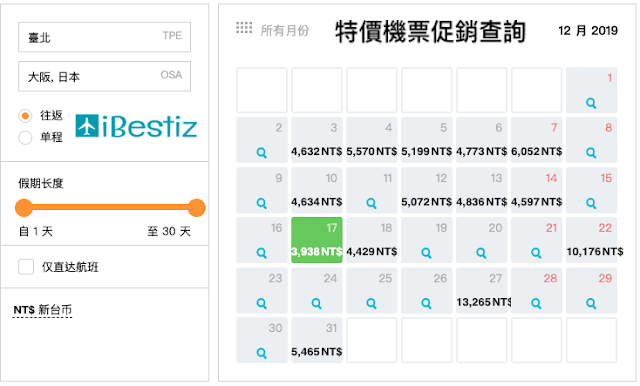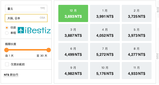 進入ibestiz特價機票網之後,找到搜尋機票的功能表單,輸入您要前往的國家,馬上會出現一年的機票價格,直接幫您顯示最便宜的月份,系統會直接幫您用綠色備註,一秒就能掌握!(此圖是以台北飛往日本大阪的範例圖,可以清楚看到,最便宜來回機票價格為12月份3693元新台幣)